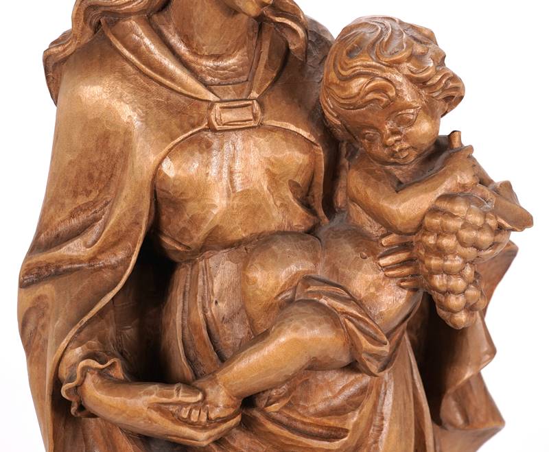 Maria mit Kind Deutsch 20. Jh. Holzfigur. Vollplastik im barocken Stil. Schön gearbeitete Maria mit Kind, das Trauben hält, auf einem Wolkenpodest. Größe ca. 21 x 13 cm, Höhe ca. 58 cm, Gewicht ca. 2,8 kg.