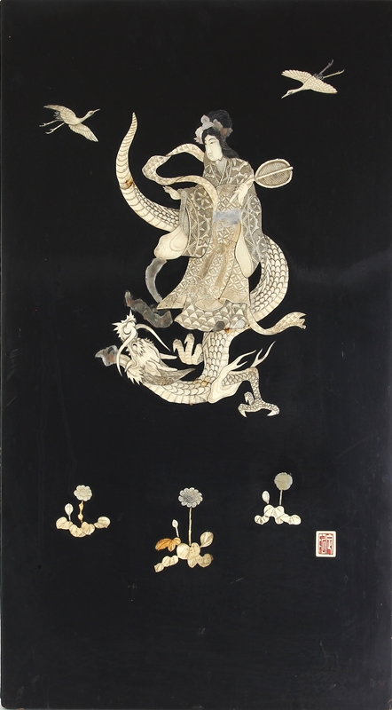 China 20. Jh. Holz, Elfenbein und Perlmutt. Zwei schwarz lackierte Tafeln, wohl ehemals Türen eines Schränkchens, mit Reliefauflage aus geschnitztem und bemaltem Elfenbein mit Perlmuttverzierungen. Eine männliche und eine weibliche Figur jeweils auf einem Drachen mit zwei Kranichen. Größe ca. 42 x 4 cm, Höhe ca. 76 cm. Gewicht ca. 6,4 kg. Minimale Verluste an Lack und Einlegearbeiten.