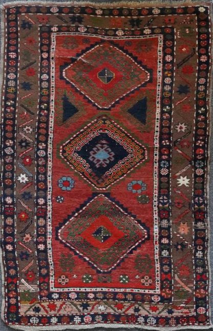 Persische Brücke Erste Hälfte 20. Jh. Wolle. Vier Bordüren, im rotgrundigen Mittelfeld drei verschiedenfarbige Carrés. Größe ca. 210 x 115 cm, ca. 3 x 3 Knoten/qcm. Gewicht ca. 5,5 kg. Teils stärker abgetreten, teils restauriert.