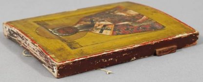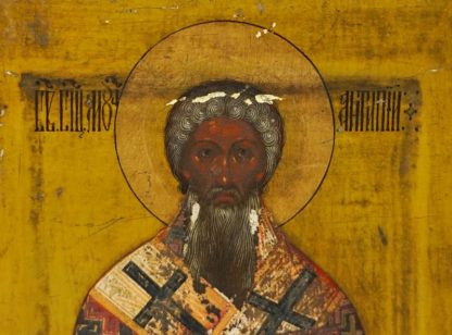 Russland, wohl um 1900. Eitempera über Kreidegrund auf Holz. Verso zwei Sponki. Vertieftes Mittelfeld mit Heiligem Antipas vor Goldgrund. In seiner linken, verhüllten Hand hält er einen Codex. Beischrift in kyrillischer Schrift. Größe ca. 18 x 14,7 cm. Teils best., teils Farbverlust.