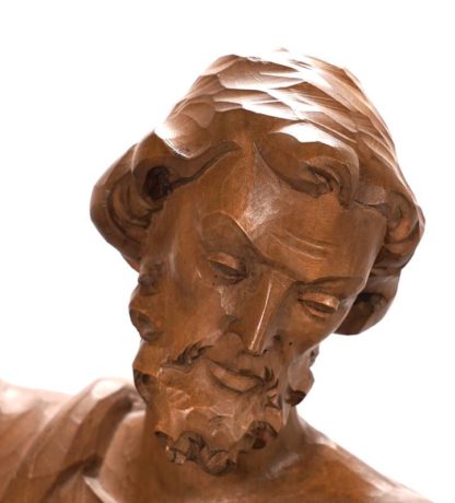 Deutsch 20. Jh. Holz vollplastisch gearbeitet. Drei fein gearbeitete Figuren. Maria kniend, Josef stehend mit Stab, das Jesuskind lose in der Krippe liegend. Unter dem Boden der Marien- und Josefsfigur je ein Etikett mit Heinrich Zunterer Oberammergau. Größe Josef ca. 24 x 13 cm, Höhe ca. 68 cm, Gewicht gesamt ca. 8,2 kg. Hände Mariens sind locker gesteckt.
