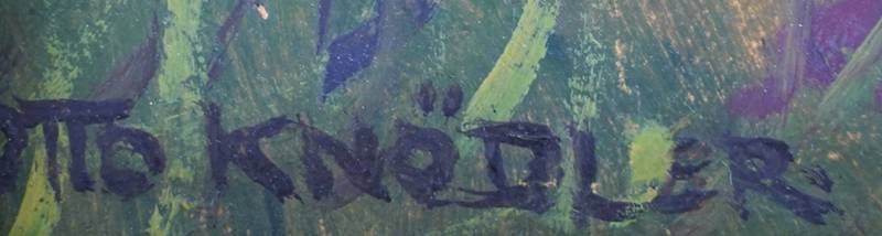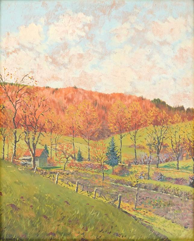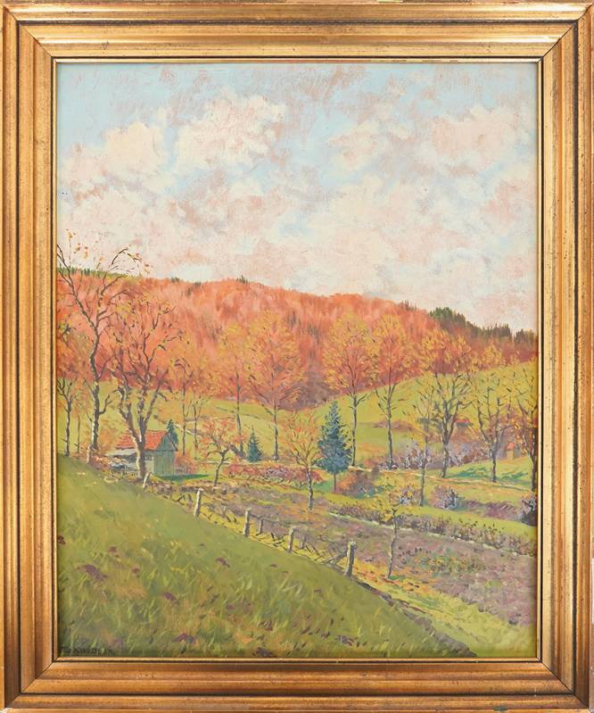 1887 Calw - 1960 Schorndorf. Herbstlandschaft. Öl auf Platte. Unten links signiert. Größe ca. 58 x 72 cm, Rahmen ca. 82 x 69 cm. Teils mit Farbverlust.
