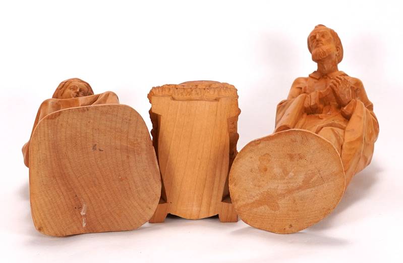 Krippenfiguren Deutsch 20. Jh. Drei Holzfiguren vollplastisch gearbeitet. Maria sitzend, die Linke zu ihrer Brust geführt, den Blick sanft auf dem Kind ruhend. Josef stehend, ebenfalls den Blick liebevoll nach unter gerichtet. Der Jesusknabe mit Nimbus und ausgebreiteten Ärmchen liegt in der Krippe. Größe Josef ca. 9 x 7 cm, Höhe ca. 25 cm.