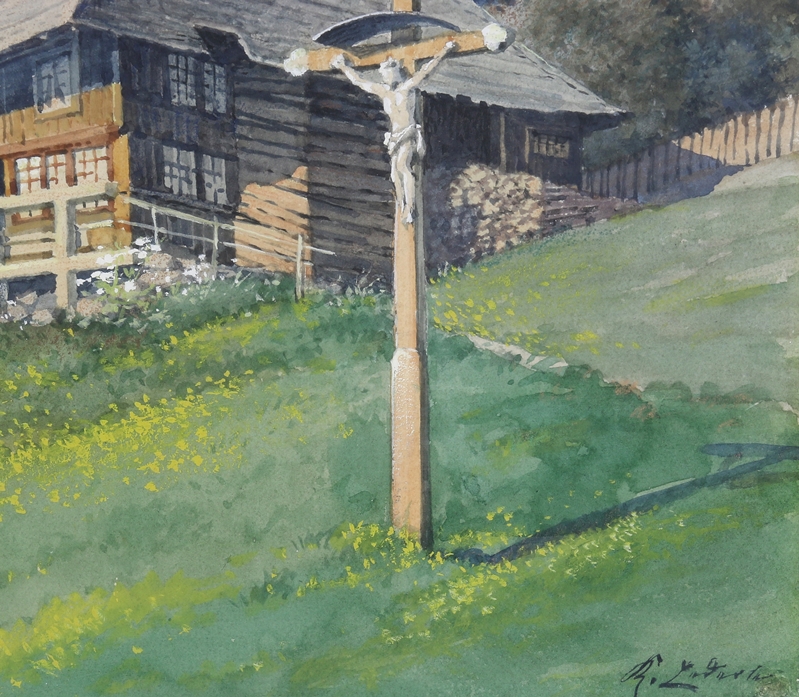 um 1900. Blick von unten auf einen Schwarzwaldhof mit Bildstock an einem Frühlingstag. Aquarell auf Papier. Unten links unleserlich signiert. Größe ca. 24 x 31,5 cm (Passepartout) hinter Glas gerahmt ca. 53 x 61,5 cm.