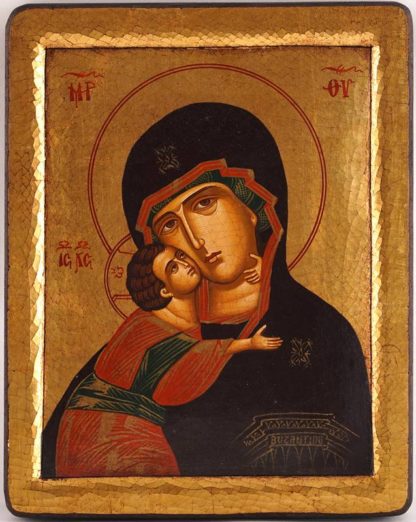 Ikone 20. Jh. Eitempera auf Holz. Maria Theotokos mit Christuskind vor Goldgrund. Beide mit Nimbus und griechischer Beischrift. Größe ca. 25 x 20 cm. Mit Craquelée.