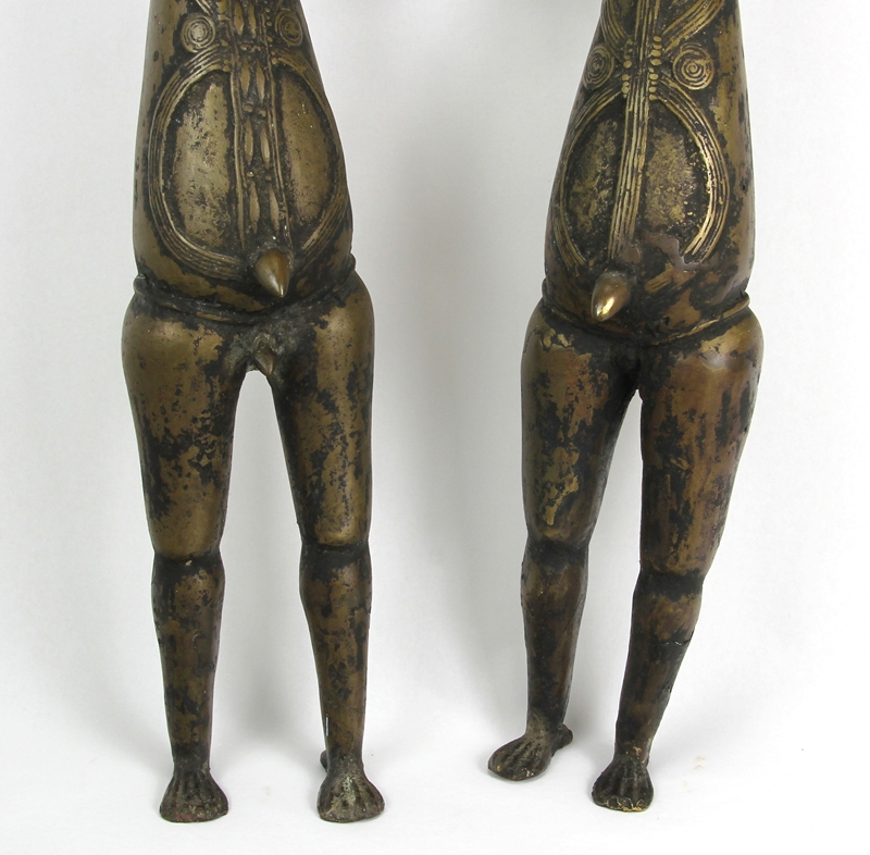 Afrika 20. Jh. Metallguss. Männliche und weibliche Figur, die Beine und der Unterkörper sind ausgeformt, der Oberkörper besteht aus einer Platte mit einem Sonnensymbol. Größe jeweils ca. 19 x 12 cm, Höhe ca. 77 cm. Gesamtgewicht ca. 12 kg.