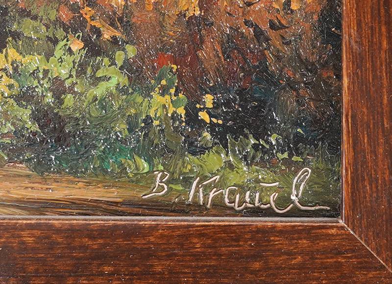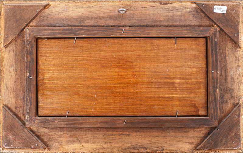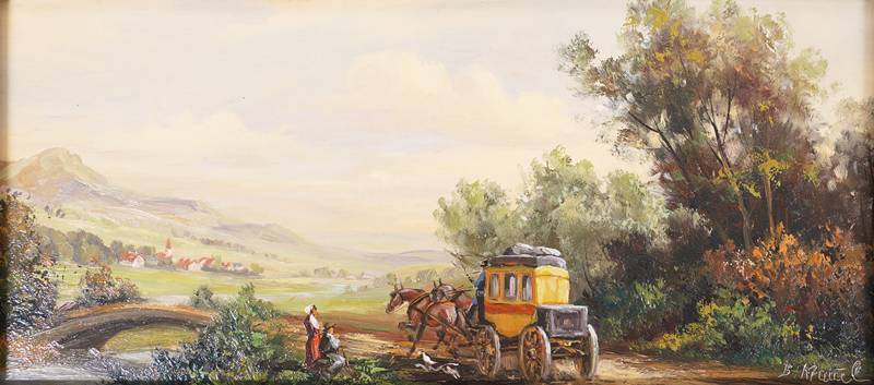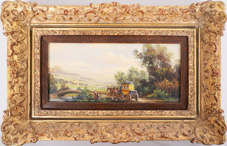 1907 Berlin - 1999 Bad Herzburg. Öl auf Holz. Postkutsche in einer bergigen Flusslandschaft. Signatur unten rechts. Größe ca. 11,5 x 25 cm, Rahmen ca. 23,5 x 36,5 cm.