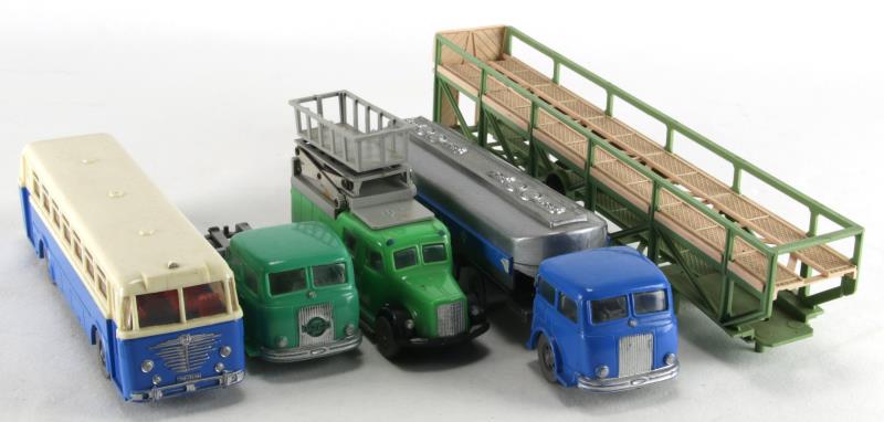 Diverse Fahrzeuge und Anhänger, u.a. Büssing Trambus, Aral Sattelschlepper, Metz V55 etc. Zustand wie abgebildet.
