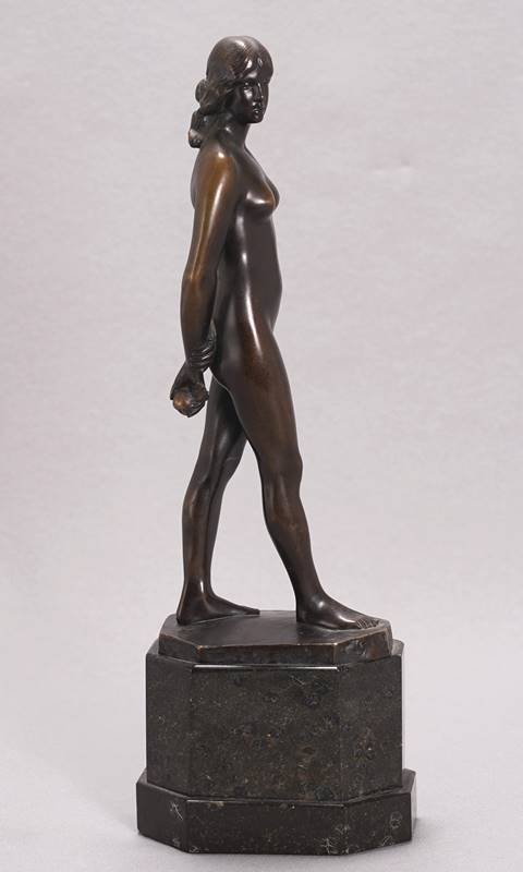 1861 Leipzig - 1932 ebd. Eva mit dem Apfel in der Hand. Bronze patiniert und getreppter Marmorsockel. Auf dem Sockel signiert und Gießerschriftzug Akt. Ges. Gladenbeck Berlin. Größe ca. 10,5 x 6,5 cm, Höhe komplett ca. 30 cm, Gewicht ca. 1,7 Kilogramm. Altersbedingter Zustand wie abgebildet.
