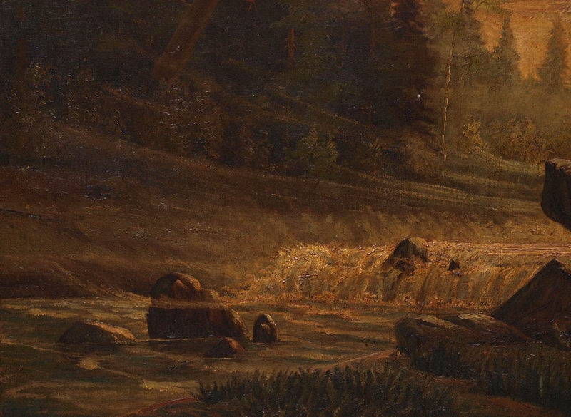 aktiv ca. 1892. Kleines Tal mit Mischwald, im Vordergrund ein tosender Gebirgsbach. Am Ufer eine einzeln stehende Birke. Öl auf Leinwand. Links unten signiert. Prunkrahmen aus dem 19.Jhdt. Größe ca. 67 x 95cm. Rahmen ca. 95 x 123 cm. Doubliert.