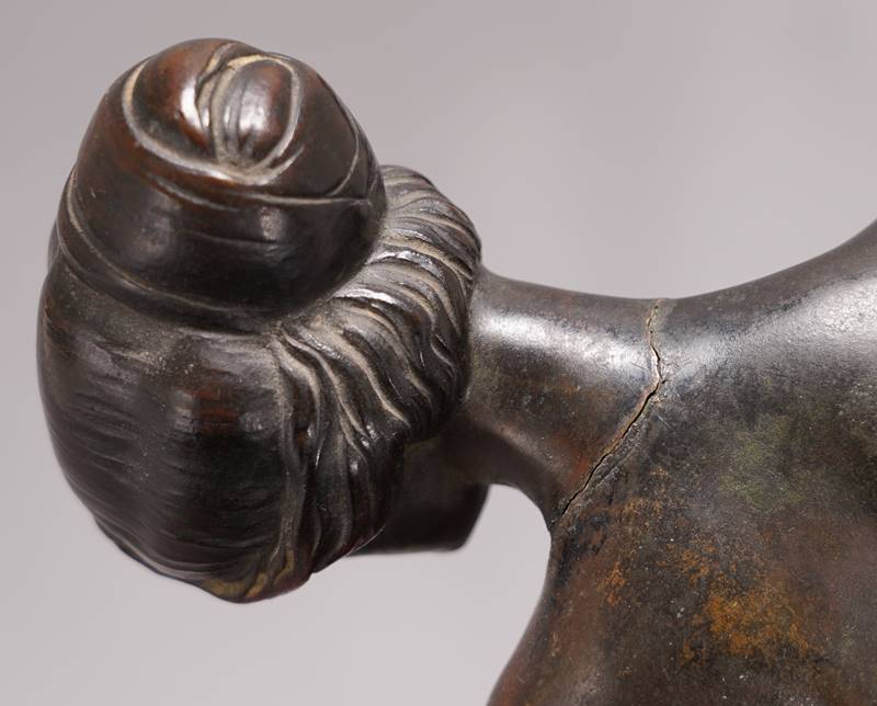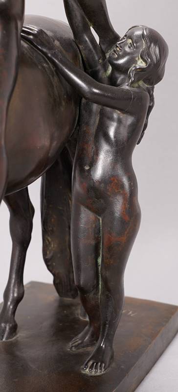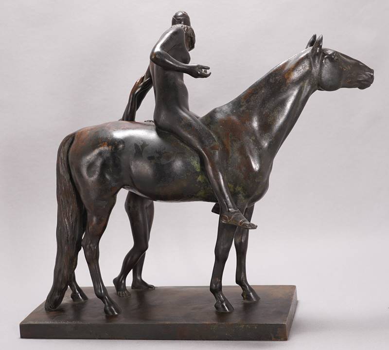 Haase, Hermann 1879 Ilsenburg - 1960 Berlin. Abschied der Amazone. Bronze patiniert. Auf der Plinthe signiert H. Haase und Gießerschriftzug Akt-Ges v. H. Gladenbeck u. Sohn. 44 x 16 cm, Höhe ca. 39 cm, Gewicht ca. 8,6 Kilogramm. Zustand wie abgebildet, Kopf und Arme angebrochen, Patina berieben. Der Versand ist wegen der Beschädigungen nicht möglich.
