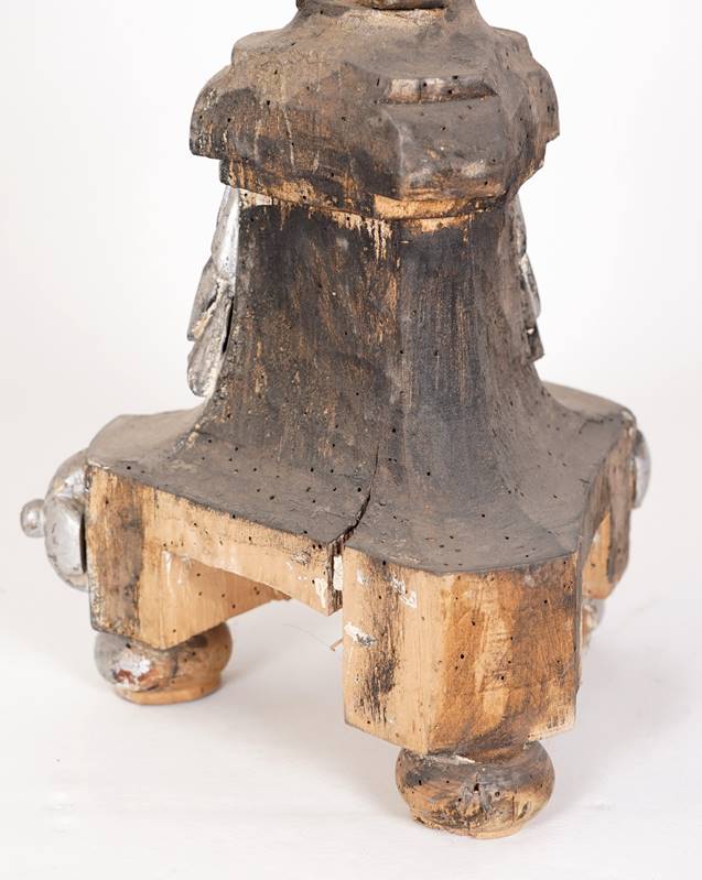 Altarleuchter Deutsch 18. Jh. Holz, geschnitzt, mit Metallmontur. Größe ca. 17 x 17 cm, Höhe ca. 81 cm. Gewicht ca. 1,84 kg. Starker Wurmbefall, nicht mehr aktiv. Teils neu gefasst.