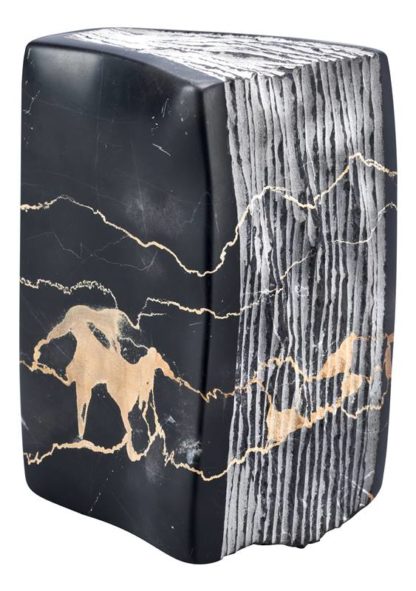 Kubach-Wilmsen, Anna Maria und Wolfgang Kubach 1937 Appeldorn - 2021 Bad Münster a. Stein bzw. 1936 Bad Münster a. Stein - 2007 ebd. «Goldaderbüchlein». 2001. La Spezia Marmor, partiell poliert. Unsign. H. 13, B. 9, T. 9 cm. Steinbuchobjekt aus italienischem Marmor des Künstlerpaares Anna Maria Kubach-Wilmsen und Wolfgang Kubach, das mit seiner mannigfaltig goldfarbenen Maserung und dem grob graviertem Buchschnitt spannungsvolle Kontraste zum polierten schwarzen Marmor aufweist. Echtheitsbestätigung: Wir danken Frau Livia Kubach, Nachlass Kubach-Wilmsen, Bad Kreuznach, für die Bestätigung der Echtheit via E-Mail, anhand von Photos, 29.08.2023. Provenienz: erworben 2002 in der Galerie Marianne Hennemann, Bonn; seitdem Privatsammlung Dreiländereck. Rechnung: Galerie Marianne Hennemann, Bonn, 24.06.2002, Rechnungsbetrag 1300 €. Sehr guter Gesamteindruck.