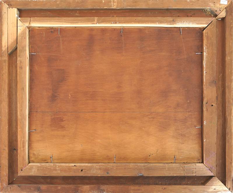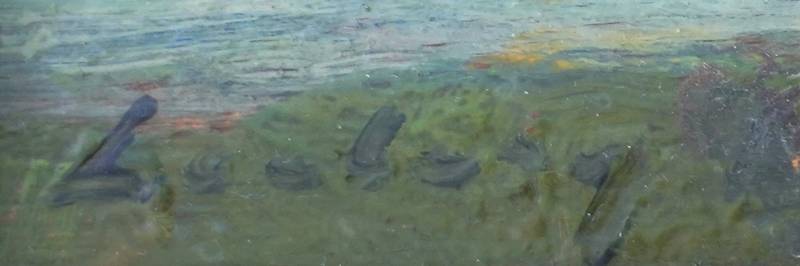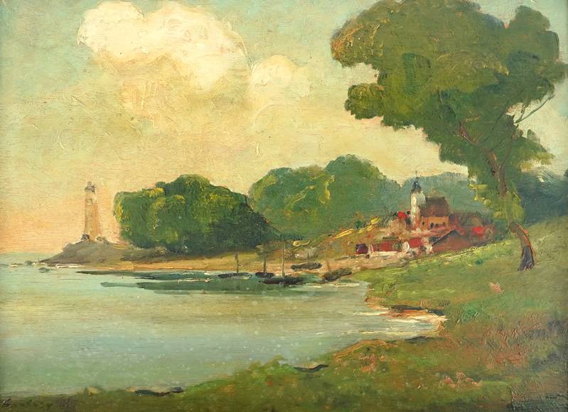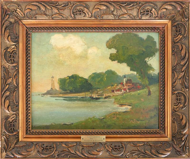 1896 Soignies - 1945 verschwunden. Küstenort mit Kirche und Leuchtturm. Öl auf Holz. Unten links signiert, auf dem Rahmen bezeichnet. Größe ca. 35 x 45 cm, Rahmen ca. 50 x 61 cm. Teils fleckig.