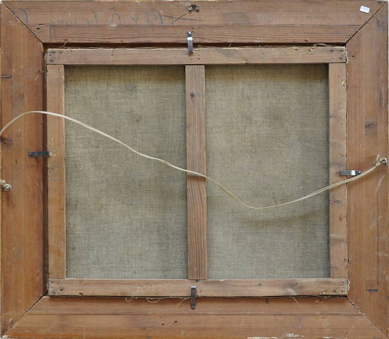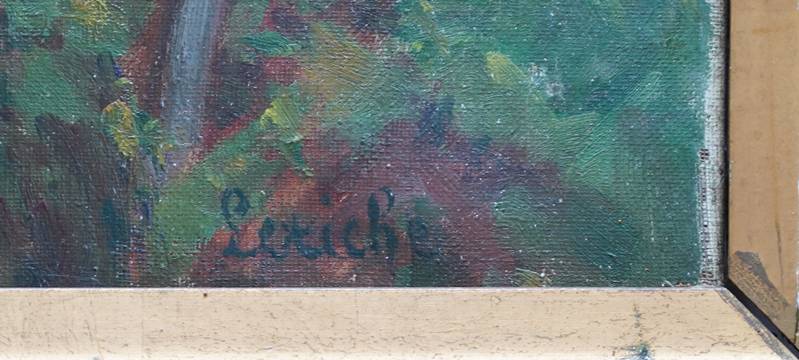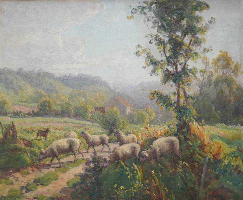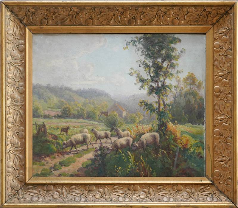 Französischer Maler wohl um 1900. Bukolische Landschaft mit Schafen. Öl auf Leinwand. Unten rechts signiert "Leriche". Größe ca. 50 x 60 cm, Rahmen ca. 68,5 x 79,5 cm. Leinwand teils leicht beschädigt.