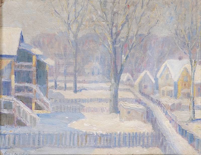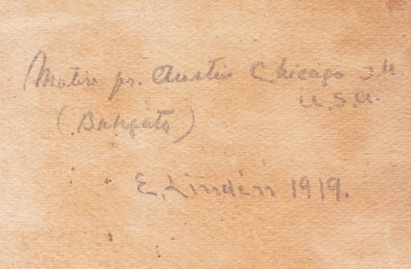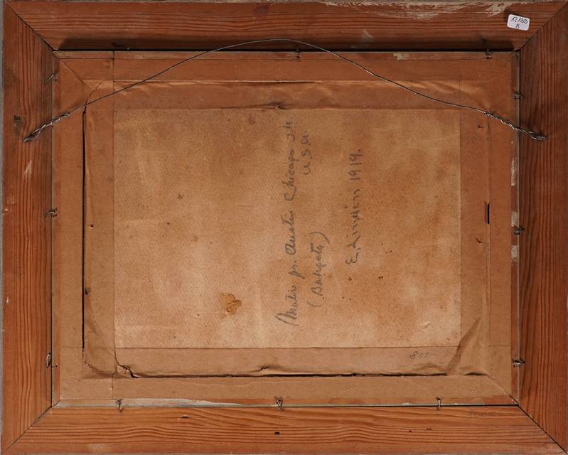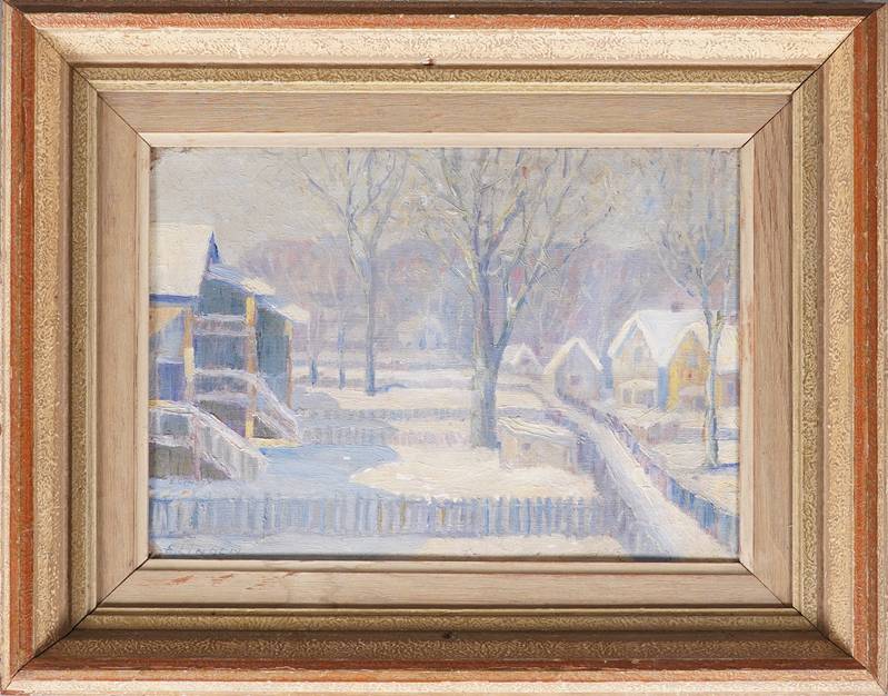 Schwedischer Künstler des frühen 20. Jh.´s. in Chicago. Öl auf Leinwand, auf Platte montiert. Ansicht eines Chicagoer Wohnviertels. Unten links zweifach signiert "E. LINDEN", unten rechts datiert 1919. Verso bezeichnet. Größe ca. 23 x 31,2 cm, Rahmen ca. 36,5 x 44 cm. Farbverlust an mehreren Stellen.