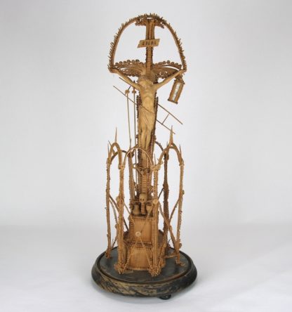 Deutsch 19. Jh. Holz. Geschnitzt und in dünnen Lagen gerollt. Christus am Kreuz unter einem Bogen. Er ist umringt von den Leidenswerkzeugen, am Fuße des Kreuzes befindet sich ein Altar. Das Arrangement wird von sechs Bögen eingefasst und auf einer Holzplatte montiert. Dazu eine Glasglocke, die aber nicht exakt auf den Fuß passt. Durchmesser der Platte ca. 19, 5 cm. Höhe ca. der Arbeit ca. 46 cm, Gesamthöhe mit Glocke ca. 53 cm.