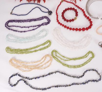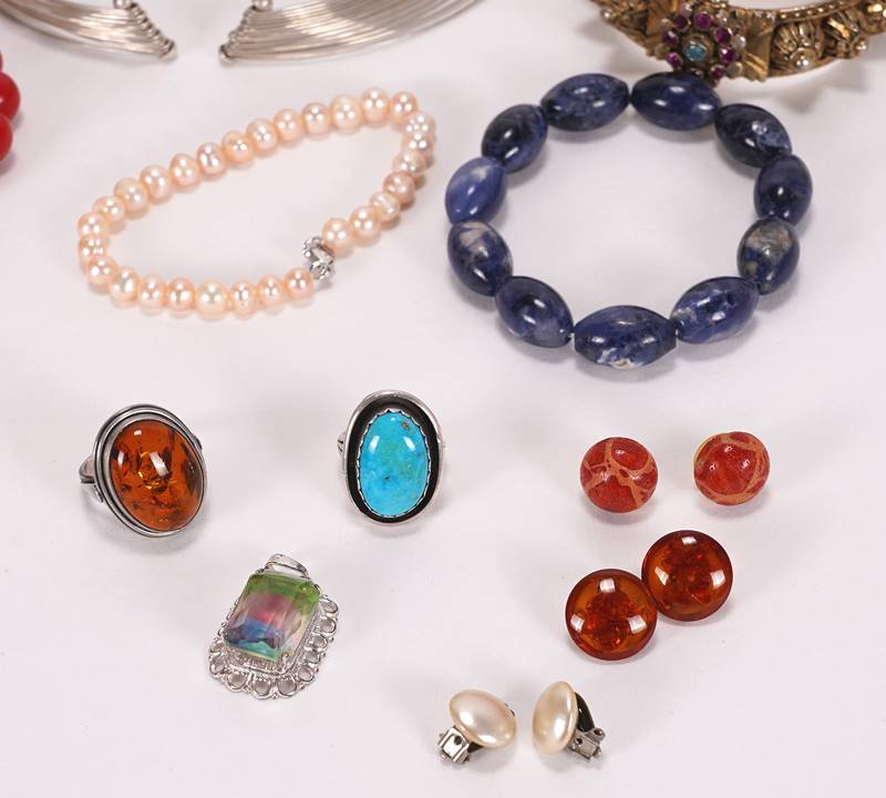 Zwei Ketten, wohl Koralle, eine Kette und ein Armband, wohl Bernstein, fünf Ketten und drei Armbänder, wohl Kunstperlen, 15 Ketten und zwei Armbänder aus verschiedenen Steinen, drei Broschen, zwei Ketten, teils Silber, zwei Ringe, zwei Anhänger, einer davon von Rosenthal Bavaria, zwei Paar Ohrclips und ein Paar Ohrstecker, ein Armband und ein Armreif.