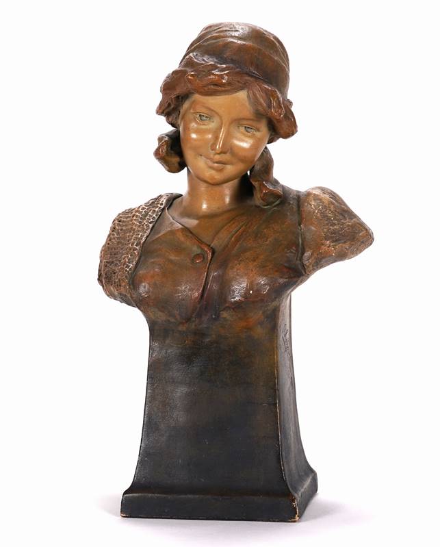 Wien, Lefont für Friedrich Goldscheider um 1900. Terrakotta in Bronzetönen staffiert. Büste einer jungen, lächelnden Frau mit Kopftuch auf viereckigem Podest. Rechte Seite Signatur eingeritzt Lefont. Rückseite mit Manufakturplakette, Nummerierung 3022, 96, 26 sowie Stempel Gesetzlich Geschützt. Größe ca. 18 x 19 cm, Höhe ca. 29 cm. Gewicht ca. 1,5 kg. Teils minimal best. und berieben.