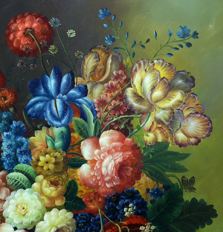 Im Altmeisterstil 20. Jh. Vielfarbige Wiesenblumen in blauer Vase auf einem Gesims. Öl auf Leinwand. Nicht signiert. Größe ca. 90,5 x 60,5 cm, der sehr stilvolle Rahmen ca. 109 x 79 cm.