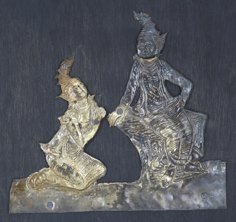 Silberrelief Thailand. Silber, teils vergoldet auf Holztafel. Größe der Figuren ca. 16 x 17cm, Größe der Platte ca. 24 x 32 cm. Gewicht ca. 0,1 kg.