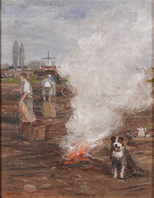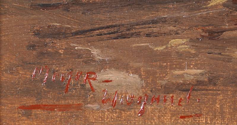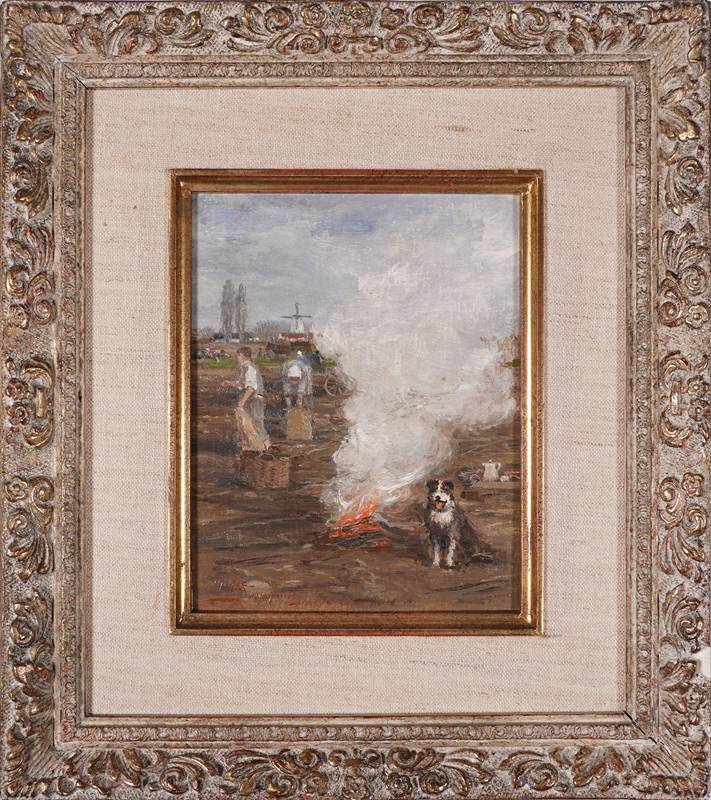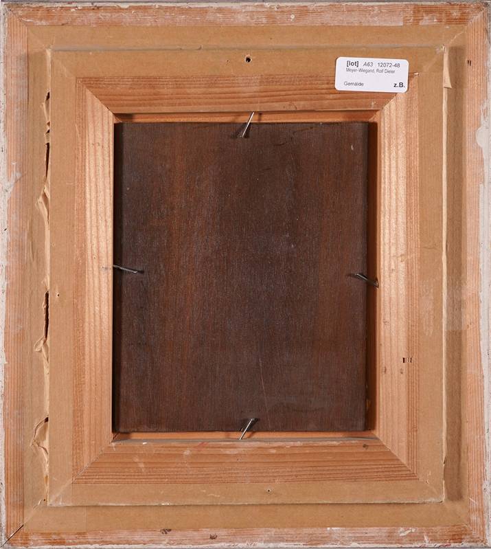 1929 Krefeld - 2006 Köln. Öl auf Holzplatte. Hund bei den Feldarbeitern. Unten links signiert "Meyer-Wiegand". Größe ca. 20 x 16 cm, Rahmen ca. 35,5 x 32 cm.