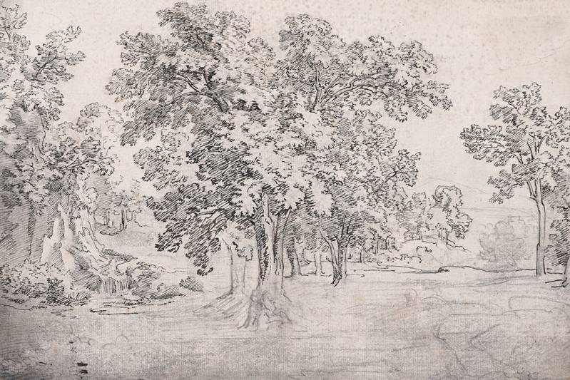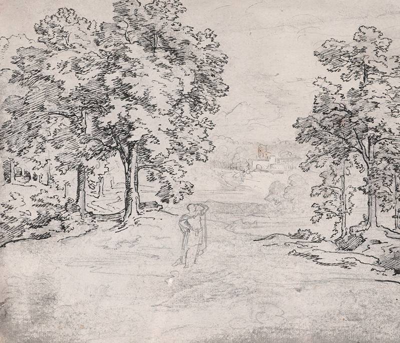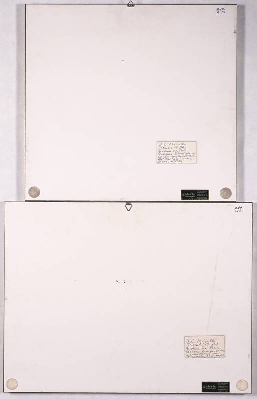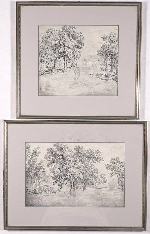 1786 Basel - 1836 ebd, attr. Zwei Landschaften. Je Tusche auf Bütten. Je verso von Sammlerhand bezeichnet. Passepartoutausschnitt ca. 20/21 x 30/25 cm, hinter Passepartout und Glas gerahmt ca. 34/35 x 44/38 cm. Nicht geöffnet.