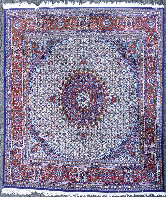 Nain Sieben Bordüren, floral durchgemustertes Innenfeld mit Medaillon und Eckzwickeln. Größe ca. 215 x 205 cm, ca. 5 x 5 Knoten/qcm, Gewicht ca. 15 kg. Zustand wie abgebildet.