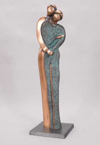 Esposto, Bernardo 1965 Saarlouis. Zusammen glücklich sein. Eng verschlungenes Paar. Bronze, teils poliert, teils grün patiniert. Ars Mundi Edition. Größe ca. 6,5 x 2 cm, Höhe ca. 28 cm, Gewicht ca. 1,9 kg.