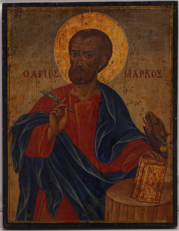 Ikone Griechenland um 1900. Evangelist Markus. Eitempera auf Holz. Größe ca. 33 x 25. Teils bestoßen, teils Farbverlust.
