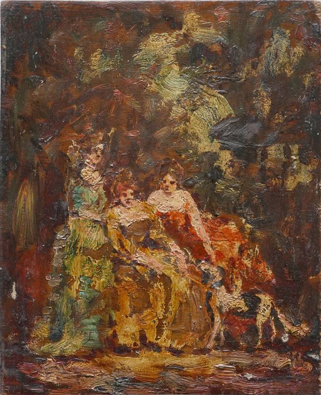 1824 Marseille - 1886 ebd., attr. Drei Frauen mit Hund im Park. Öl auf Holztafel. Größe ca. 26 x 21 cm. Teils minimalster Farbverlust.