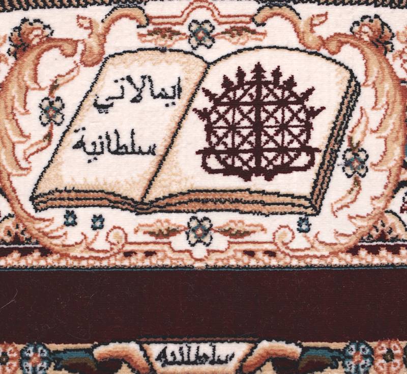 Persien 20. Jh. Seidenteppich. Gebetsteppich mit einer Bordüre, darauf ein aufgeschlagener Koran mit Vers, Signatur jeweils am oberen und unteren Rand des Teppichs. Innenfeld gerahmt von einer architektonischen Nische, mit Blumenranken darunter. Größe ca. 88 x 57 cm, ca. 10 x 10 Knoten/qcm. Zustand wie abgebildet.