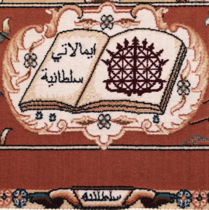 Persien 20. Jh. Seidenteppich. Paradiesteppich mit einer Bordüre, darauf ein aufgeschlagener Koran mit Vers, sowie mehrere Vögel, ein Reh und ein Raubtier. Innenfeld mit drei weiteren Rehen. Signatur jeweils am oberen und unteren Rand des Teppichs. Größe ca. 88 x 57 cm, ca. 10 x 10 Knoten/qcm. Zustand wie abgebildet.