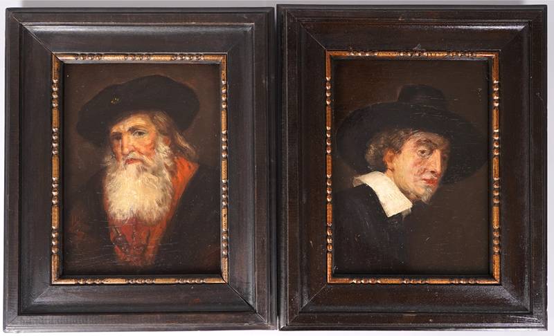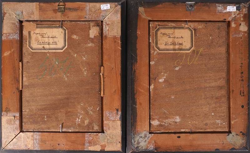Späterer Kopist. Zwei Portraits. Je Öl auf Holz. Je verso auf Etikett von Sammlerhand bezeichnet. Größe je ca. 22 x 16 cm, Rahmen ca. 31,5 c 25,5 cm. Teils mit Craquelé.