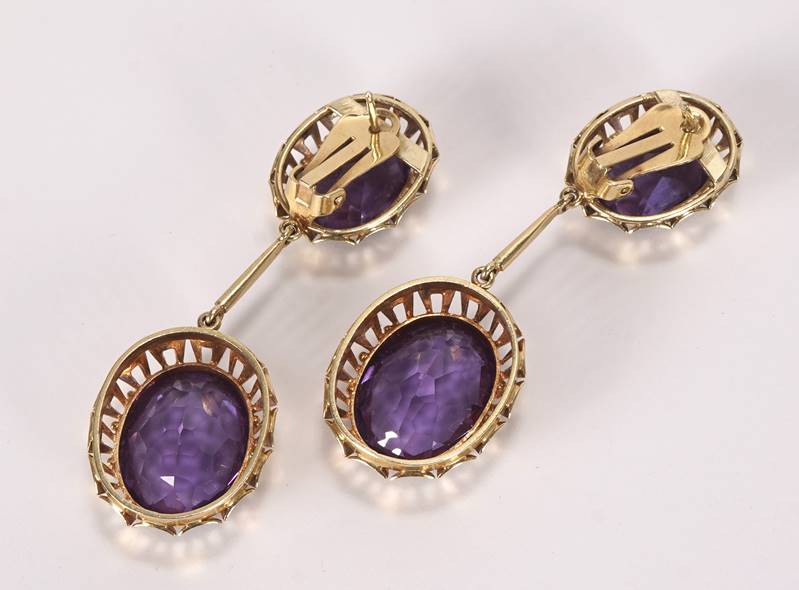 Deutsch 1970-er Jahre. Gelbgold 585 (nicht punziert, geprüft). Zweiteilig beweglich gearbeitet mit Clip bzw. Dorn. Je zwei unterschiedlich große, wohl behandelte Saphirsolitärs (Größe ca. 21 x 16 mm bzw. 15 x 12 mm). Länge ca. 7 cm, Gewicht komplett ca. 34,5 Gramm. Sehr schöne Juweliersarbeit.