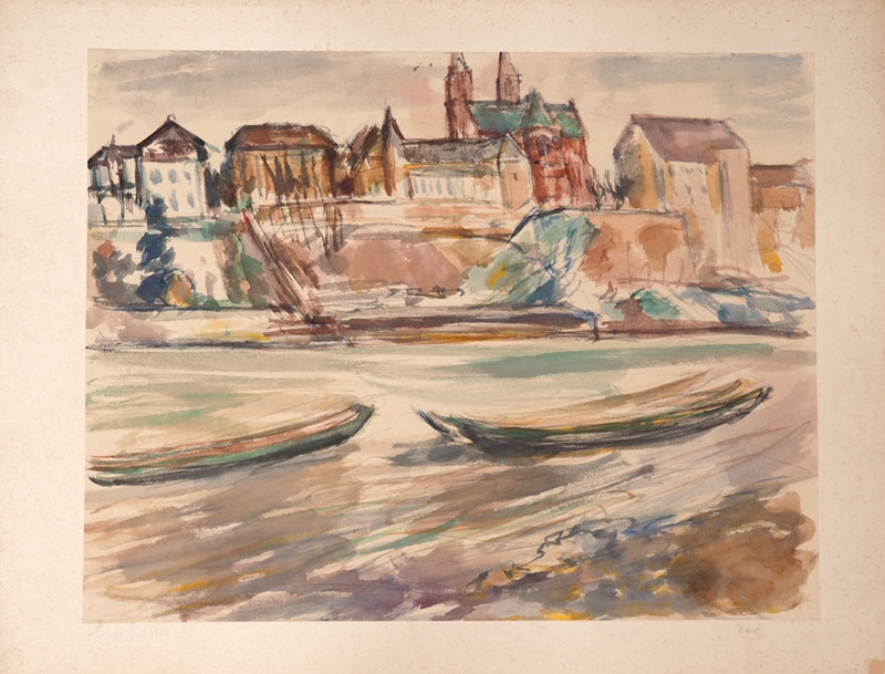 1885 Freiburg i. Br. - 1955 Zürich. Zwei in Basel auf dem Rhein liegende Fährboote mit Blick auf das Münster. Aquarell auf Karton aufgezogen. Links unten signiert und datiert 1928. Rechts unten auf dem Karton bezeichnet Basel. Blattgröße ca. 41 x 53 cm; Blick vom Rhein aus auf das Breisacher Rheintor mit angedeuteter Häuserflucht zur Rechten. Aquarell auf Karton aufgezogen. Unten rechts signiert und datiert 1935. Blattgröße ca. 40 x 53 cm. Beide Blätter stammen aus dem Ateliernachlass des Künstlers.