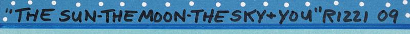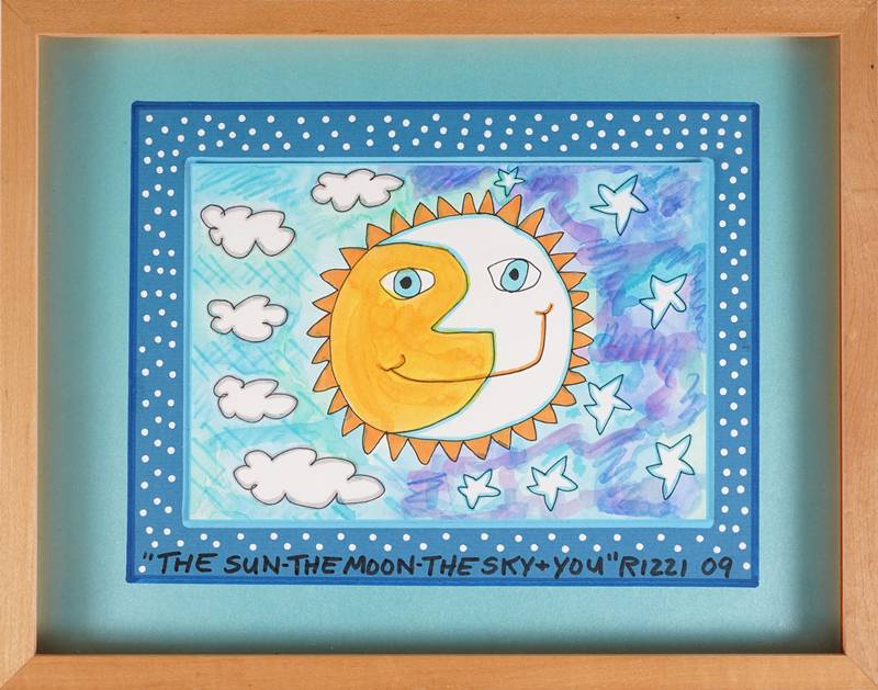 1950 New York - 2011 ebd. "The Sun-The Moon-The Sky+You". Mischtechnik auf Papier. Unten rechts signiert und datiert (20)09. Größe ca. 16,5 x 22 cm, hinter Glas gerahmt ca. 23,5 x 30 cm. Der Rahmen wurde nicht geöffnet.