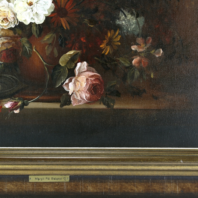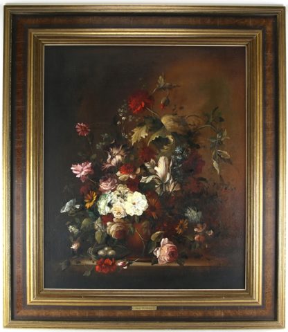 Ungarischer Künstler *1939. Blumenstillleben mit Vogelnest. Öl auf Leinwand. Unten rechts signiert, Plakette am Rahmen unten. Größe ca. 60 x 50 cm, Rahmen ca.80 x 70 cm.