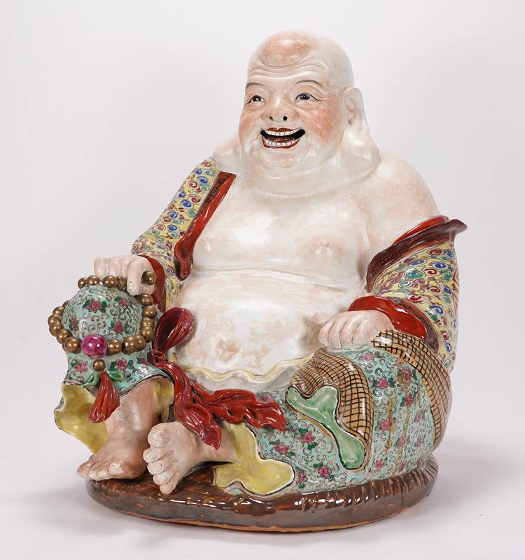 China 20. Jh. Porzellan Famille rose. Sitzender lachende Buddha, ein sogenannter Budai. Er ist teil der chinesischen Volkreligion. Sein dicker Bauch symbolisiert Reichtum, die Sitzhaltung und das Lachen Zufriedenheit und Gelassenheit. Größe ca. 36 x 39 cm, Höhe ca. 45 cm. Gewicht ca. 15 kg.