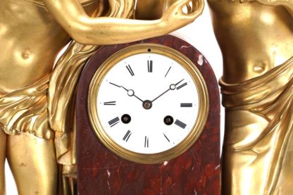 Frankreich, Marti & Cie um 1860. Bronze und rot/brauner Marmor. Auf vier Löwenfüßen ein Marmorsockel mit Mäanderfries und weiterer Sockel auf dem zwei Figuren stehen. Beide lehnen sich über dem Uhrengehäuse einander zu, als Allegorie der Liebenden. Rundes Messingräderwerk mit ersetzter Pendelfederaufhängung und Schlag zur halben und vollen Stunde auf Glocke. Gemarkt mit runder Manufakturmarke und Medaille de Bronze (in der Literatur mit dem Jahr 1860 vermerkt), nummeriert 794 9 und Ovalstempel. Offenes Emaillezifferblatt mit schwarzem Zeigern und lateinischen Ziffern. Größe ca. 47 x 20 cm, Höhe ca. 65 cm. Gewicht ca. 33 Kilogramm. Uhr läuft an und schlägt.