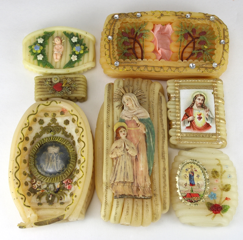 Konvolut Wachsobjekte Deutsch 19./20. Jh. Klosterarbeiten teils mit Devisen bzw. Figuren. Größtes ca. 16 x 8 cm.