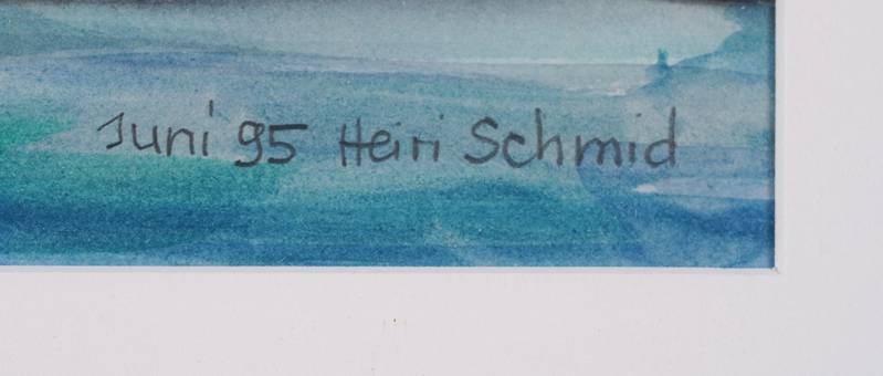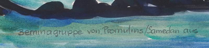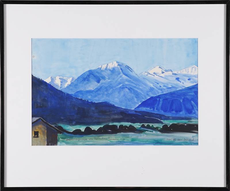 Schweizer Maler des 20. Jh´s. "Berninagruppe von Promulins/ Samedan aus". Aquarell auf Papier. Unten rechts signiert "Heiri Schmid", links betitelt. Hinter Passepartout und Glas gerahmt. Passepartoutausschnitt ca. 28,5 x 44 cm, Rahmen ca. 50,5 x 60,5 cm. Am linken Rand zwei Flecken.