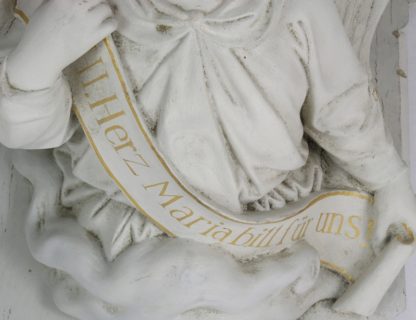 Deutsch 19. Jh. Geschnitztes Holz. Weiß und Gold staffiert. Engel trägt die Konsole mit der Aufschrift "Hl. Herz Jesu erbarme dich unser" auf seinen Schultern und hält ein Schriftband mit der Aufschrift "Hl. Herz Maria bitt für uns". Größe ca. 49,5 x 59,5 cm, Höhe ca. 42,5 cm. Gewicht ca. 13,6 kg. Guter Zustand.