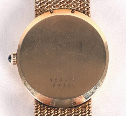 Vintageuhr in Gelbgold 750 auf dem Deckel und im Band punziert. Automatikuhrwerk (Baumatic) mit Saphirkrone. Goldenes, ovales Zifferblatt mit goldenen Zeigern und Stiftminuterie. Hinten Werknummer 485574 und Referenznummer 37065 T. Durchmesser Uhr ca. 32 x 30 mm, Länge ca. 17 cm, Gewicht ca. 66,7 Gramm. Gebrauchter Zustand wie abgebildet, Uhr läuft an.