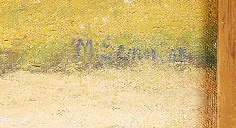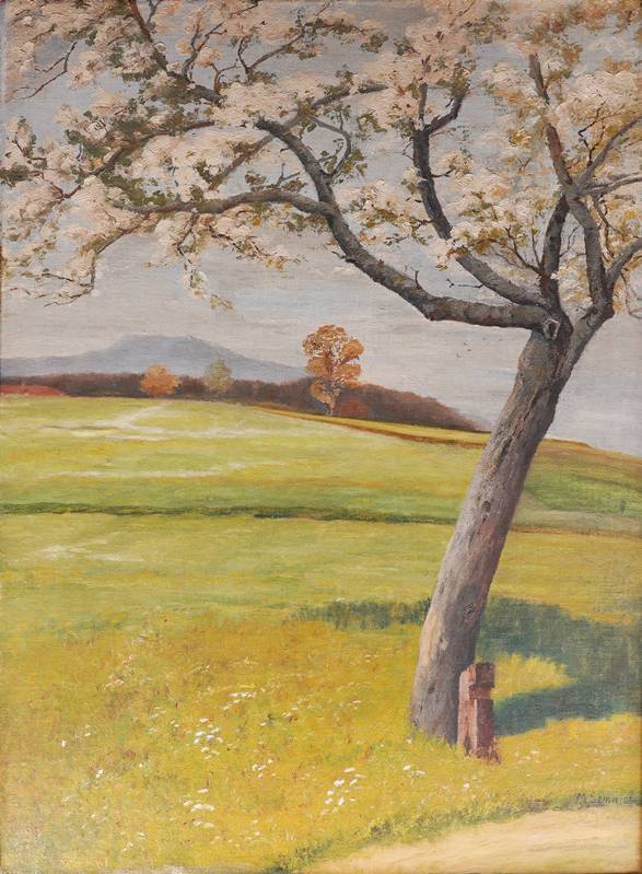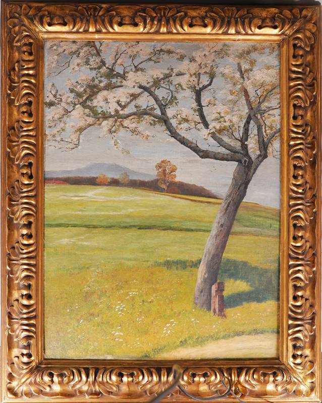 Schweizer Künstler um 1900. Obstbaum in der Blüte. Öl auf Leinwand auf Holz. Unten rechts signiert und datiert (19)08. Größe ca. 85 x 64 cm, schöner Jugendstilrahmen ca. 106 x 85 cm. Zustand wie abgebildet.