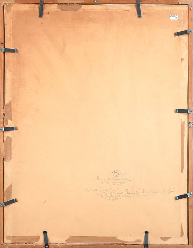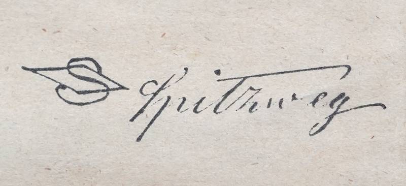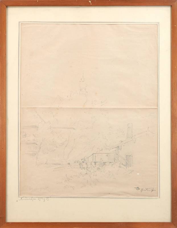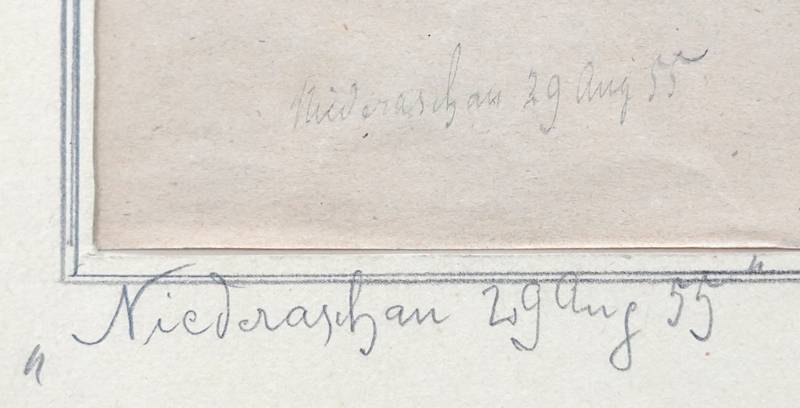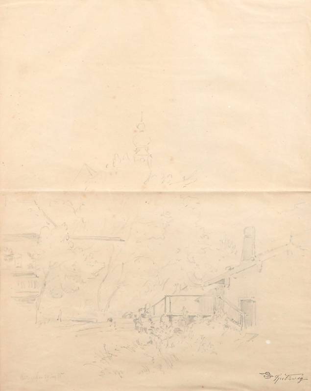 1808 München - 1885 ebd. Studienblatt mit einer Ansicht von Niederaschau. Bleistift auf Papier, hinter Glas und Passepartout gerahmt. Unten links mit Bleistift bezeichnet und datiert "Niederaschau 29 Aug 55". Unten rechts mit Nachlassstempel "Spitzweg". Verso auf dem Blatt mit Bleistift von Sammlerhand bezeichnet. Auf dem Passepartout nochmals mit Bleistift der Titel und das Datum. Verso auf der Rahmenrückseite von Sammlerhand bezeichnet. Am oberen Blattrand im Passepartout klebemontiert. Mittig mit Bugfalz quer verlaufend. Blattgröße ca. 43,3 x 33,7 cm, Rahmen ca. 55 x 42,5 cm. Blatt mit Lichtschatten und teils leicht fleckig sowie gewellt.