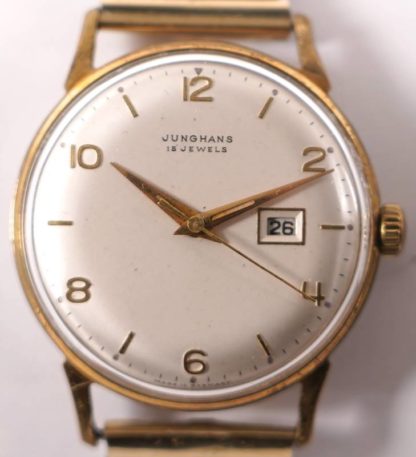 Vintage Junghans Armbanduhr Deutsch 20. Jh. Ziffernblatt mit arabischen Stundenzahlen und Datumsanzeige bei der Drei. Handaufzugswerk. Goldfarbenes Flexband. Auf dem Ziffernblatt und verso bezeichnet. Durchmesser des Ziffernblatts ca. 3 cm, Länge des Bandes ca. 20 cm. Guter gebrauchter Zustand, läuft an.