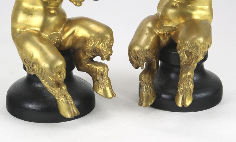Paar Bachantenkinder 18. Jh. Bronze auf Holzsockel. Musizierende Kinder jeweils mit Geißbeinen. Größe jeweils ca. 7 x 9 cm, Höhe jeweils 18 cm, Gesamtgewicht ca. 3,25 kg. Guter Zustand.