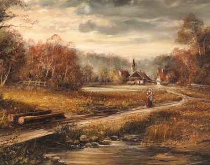 F. Brucker Deutsch 19. Jh. Landschaftsgemälde mit einem Bachlauf im Vordergrund, einem Dorf im Hintergrund und einer Frau, die sich auf einem Pfad dem Bach nähert. Öl auf Leinwand. Unten links signiert. Größe ca. 50 x 60,5 cm, Rahmen ca. 65,5 x 75,5 cm.