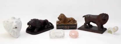 Konvolut Löwen Ein liegender und ein stehender Holzlöwe, geschnitzt. Ein liegender Löwe, Keramik, England 1939, eine Wandapplike in Form eines Löwenkopfes, Porzellan, England 1880, ein kleiner stehender Löwe, Porzellan und zwei Ascher mit Löwenreliefs aus Glas. Insgesamt ca. 7 Stück. Maximale Größe ca. 23 x 12 cm, Höhe ca. 11 cm. Teils bestoßen, teils berieben.